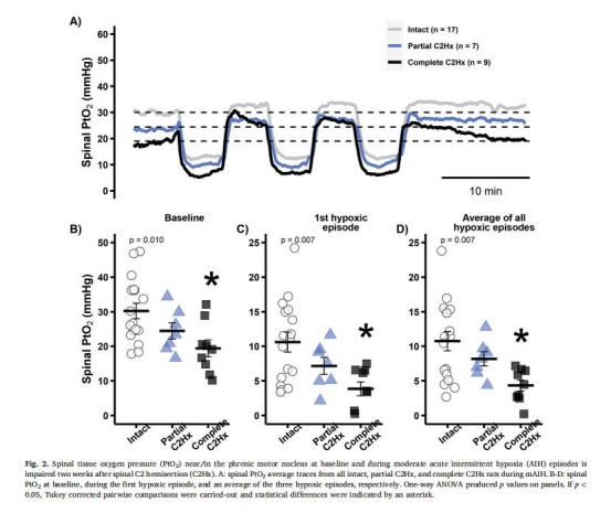 本研究探討中度急性間歇性缺氧(mAIH)對大鼠頸髓半切(C2Hx)后脊髓組織氧合及神經可塑性(膈神經長時程易化,pLTF;交感神經長時程易化,sympLTF)的影響。關鍵發現包括:
