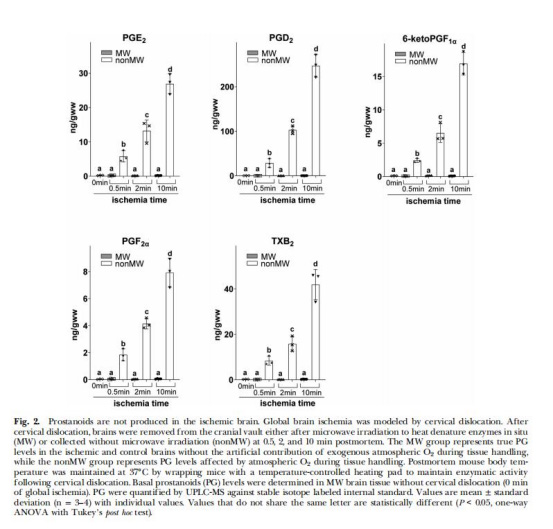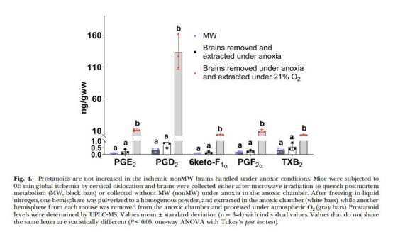 暴露于大氣氧觸發(fā)PG合成:非微波固定的缺血腦組織在取樣時(shí)接觸大氣氧后PG升高30倍;