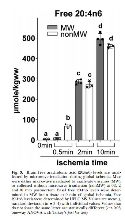 數(shù)據(jù):缺血2–10分鐘,游離20:4n6升高50–100倍(MW與非MW組無差異),但僅非MW組PG同步升高。