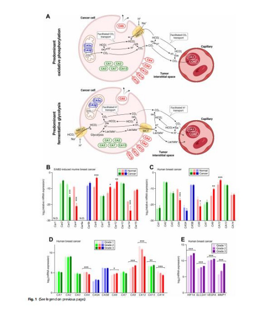 碳酸酐酶(CAs)——尤其是胞外異構體(CA4/6/9/12/14)——在乳腺癌中動態表達,通過催化CO?/HCO??緩沖反應降低腫瘤微環境酸度。