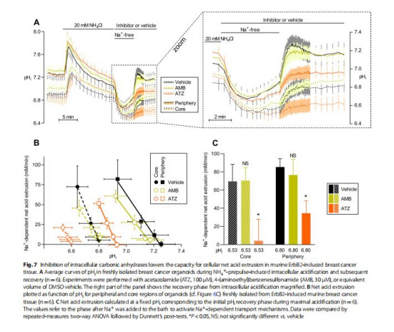 從人/鼠乳腺癌組織分離原代器官團,使用熒光探針(BCECF、carboxy-SNARF-1、Fluorescein DHPE)實時監測胞內/胞外pH動態。