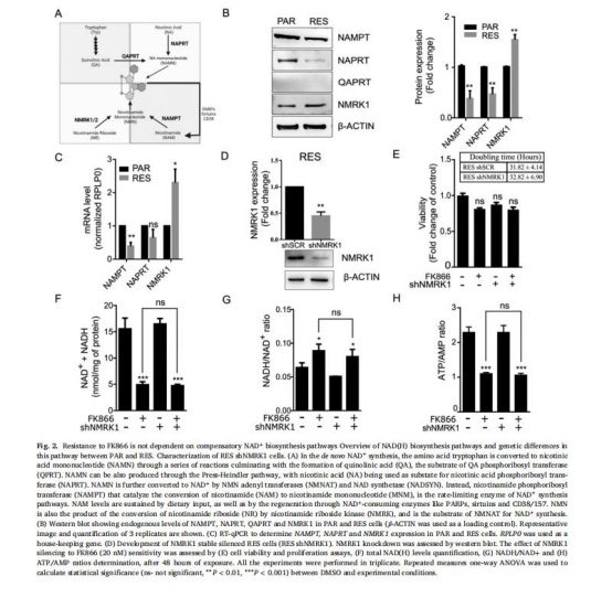 數據:RES細胞NAMPT/NAPRT下調、NMRK1上調,但NMRK1沉默不增敏FK866;NAD(H)/ATP水平不變。
