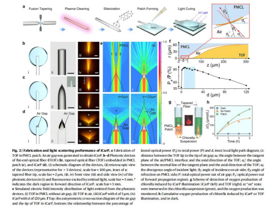 核心結構:錐形光纖(TOF)嵌入可生物降解透明聚酯(PMCL)貼片,TOF與PMCL間預留可控微米級空氣間隙(圖1a)。