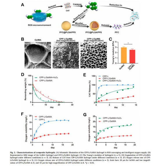 本研究開發(fā)了一種新型智能水凝膠(CPP-L/GelMA),通過整合過氧化氫酶(CAT)和ROS響應性釋氧納米顆粒(PFC@PLGA/PPS),實現(xiàn)以下功能: