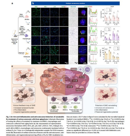 驗(yàn)證持續(xù)H?供給對多種衰老細(xì)胞(BMSCs、巨噬細(xì)胞、骨細(xì)胞)的抗炎及抗衰老作用。