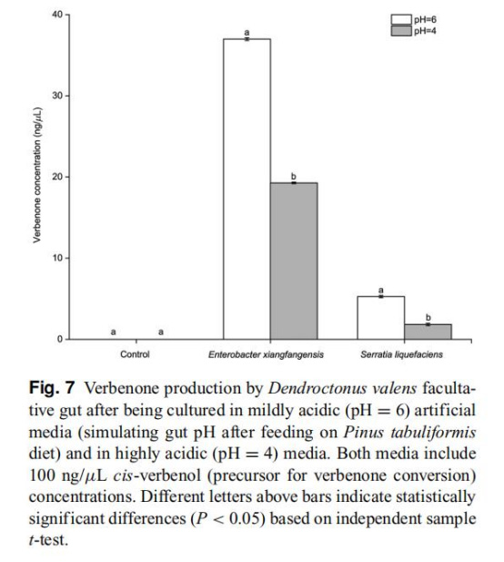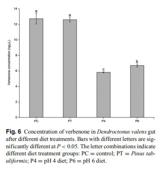 偏離天然pH(pH 4.7)的飼料(pH 4或6)顯著改變腸道pH,降低優勢菌豐度(如 Enterobacter ↓50%)和verbenone產量(↓70%)。