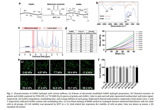 調控GelMA濃度(10–30%)和紫外交聯時間(30–90秒)制備不同剛度水凝膠(圖1a-d)。