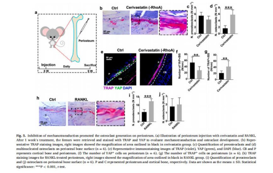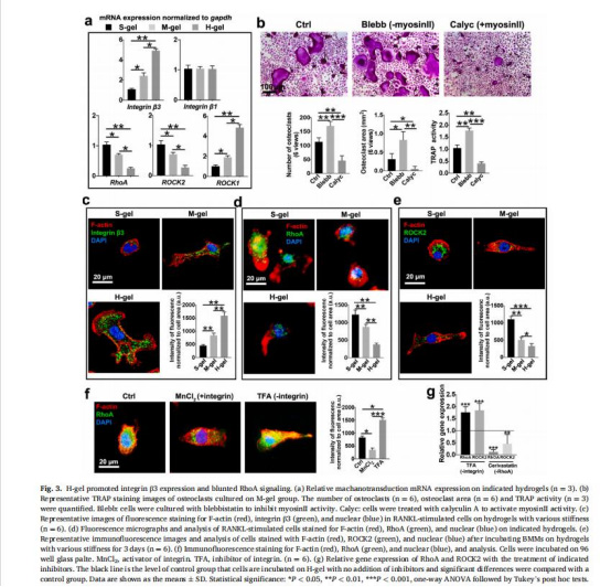 意義:揭示剛度通過整合素負調控RhoA-ROCK2通路,削弱力學傳導,促進NF-κB驅動的破骨細胞分化(圖4f-i)。
