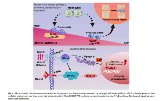 力學傳導核心機制:基質剛度通過整合素β3-RhoA-ROCK2-YAP通路負調控力學信號,激活NF-κB促進破骨細胞分化(圖8)。