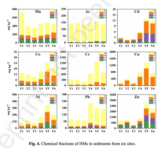 分布特征:活性態Zn/Cr/Ni與Fe/Mn顯著負相關;溶解態濃度普遍高于活性態;上游工業區(Y5-Y6)重金屬總量超標嚴重(Cd超背景值55.6倍)。