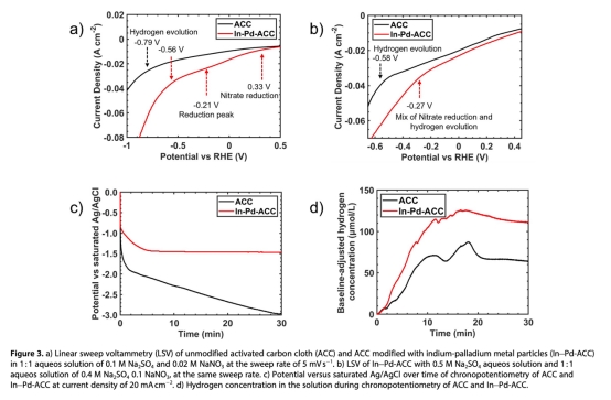 電化學(xué)活性數(shù)據(jù):LSV曲線顯示In-Pd-ACC陰極在-0.27 V vs RHE起始硝酸鹽還原,Tafel斜率低(圖3a-b)。意義:證明In-Pd降低反應(yīng)能壘,優(yōu)化催化路徑。來源圖3a-b。
