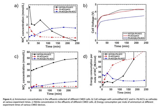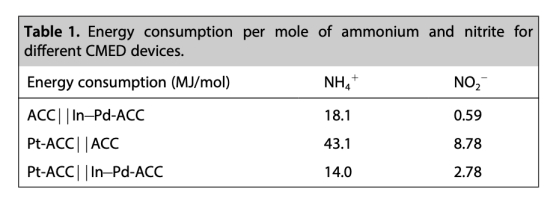裝置性能:構(gòu)建CMED流動(dòng)池,測(cè)試不同電極組合(如Pt-ACC||In-Pd-ACC)的氨產(chǎn)率、亞硝酸鹽生成、能量消耗和金屬浸出(圖4,表1)。