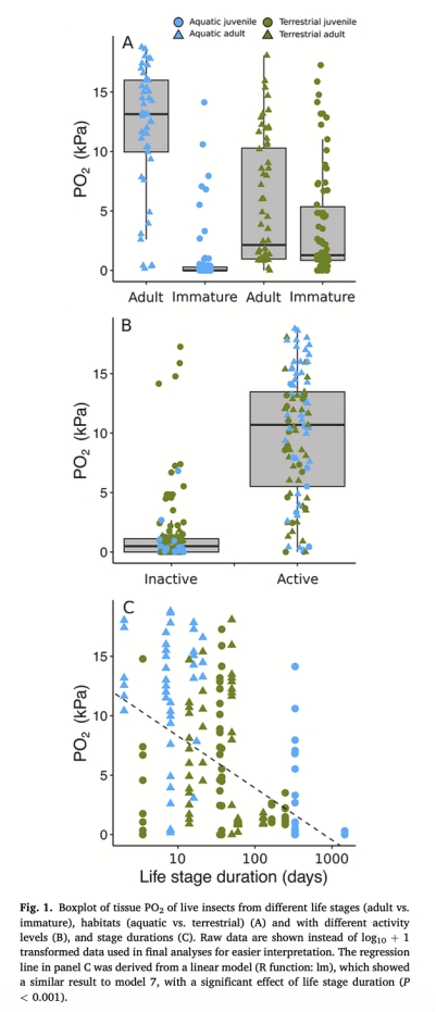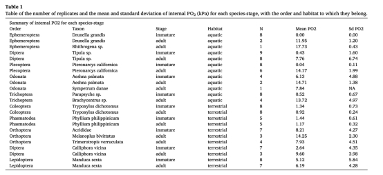 水生昆蟲幼體(蜉蝣目、襀翅目、毛翅目、雙翅目)維持極低PO?(均值0.88 kPa),陸生成體PO?較高(均值13.3 kPa)。