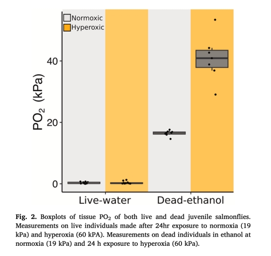 活體石蠅幼體在高氧水(60 kPa)中PO?維持0.04 kPa(無變化),死亡個體PO?隨環(huán)境氧升高(19 kPa→32 kPa)。
