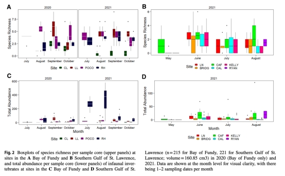物種豐富度與豐度(圖2):圣勞倫斯灣站點豐富度顯著低于芬迪灣(p<0.001)。意義:揭示區(qū)域環(huán)境差異對生物多樣性的塑造作用。