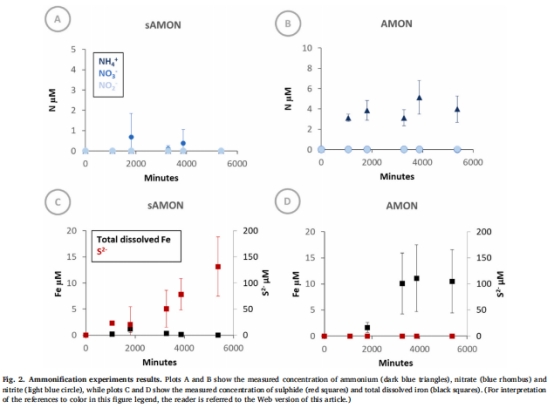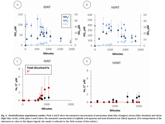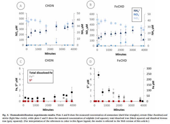 數(shù)據(jù):∑S2?在表層沉積物實(shí)驗(yàn)(sAMON)中積累(130 μM),深層(AMON)無(wú)積累(圖2C,D);Fe2?在反硝化/CDNT實(shí)驗(yàn)中釋放(圖3C,D, 圖4C,D)。
