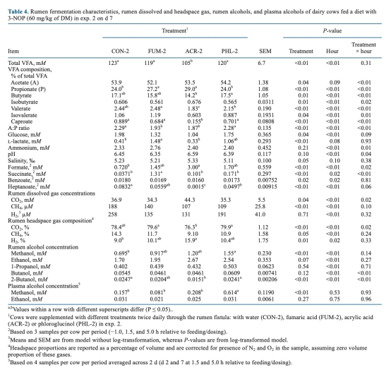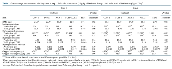 實驗2:3-NOP(60 mg/kg DM)為基礎抑制劑,投加富馬酸(FUM-2)、丙烯酸(ACR-2)、間苯三酚(PHL-2)或對照(CON-2)。