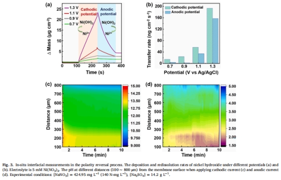 極性反轉優勢:周期性反轉電極極性可在膜界面200μm范圍內實現pH劇烈切換(陰極區pH>13 → 陽極區pH<2),實現Ni(OH)?的可逆沉淀與溶解(圖3c-d)。