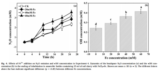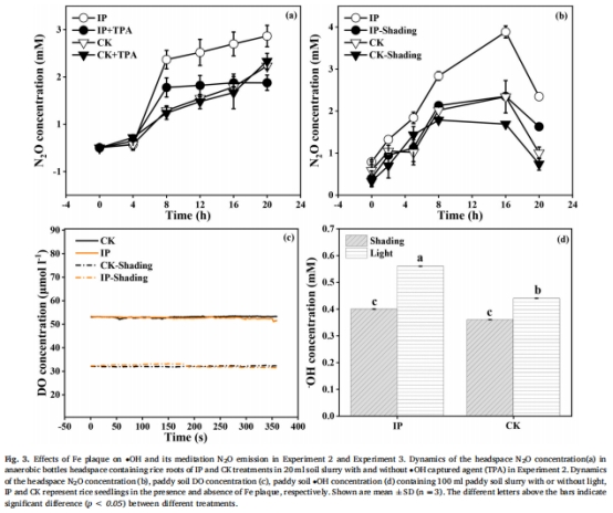 鐵膜處理組(IP)·OH濃度比對照組(CK)高1.5-2倍(圖1d-e),N?O排放量高2-3倍(圖1f),N?O/(N?O+N?)比率高3倍(圖1h)。
