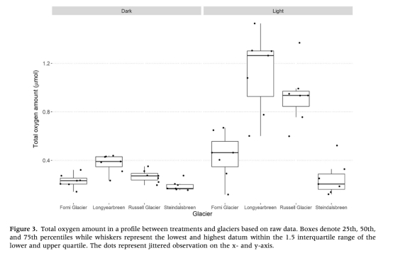 光照下所有樣品均出現厭氧區,深度因冰川來源而異(北極冰川3100μm vs. 阿爾卑斯冰川1500μm);