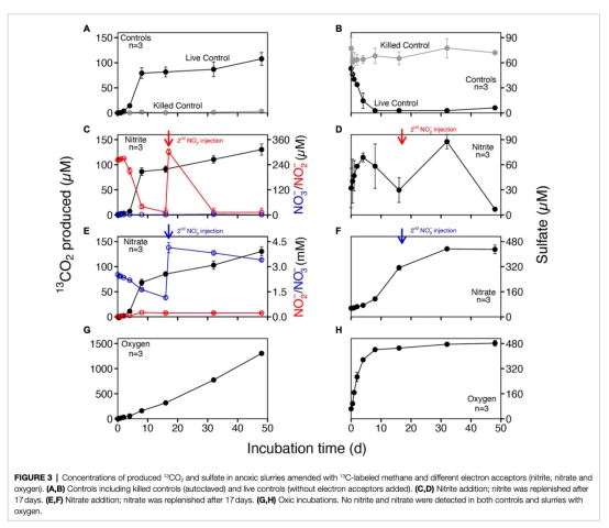 意義:證實硫酸鹽(圖2A)、硝酸鹽/亞硝酸鹽(圖3C-F)及金屬氧化物(圖2A)均未顯著促進AOM;氧氣添加使13CO?產量激增10倍(圖3G),凸顯好氧途徑的高效性。