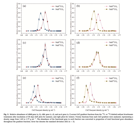DNA-SIP結(jié)果(圖5):13C標(biāo)記后cbbM基因在浮力密度~1.729 g mL?1處富集,而cbbL基因無顯著偏移。