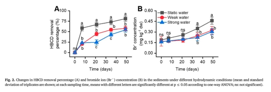 數據內容:49天后靜水組HBCD降解率(81.2%)顯著高于弱水流(57.9%)和強水流(54.3%),Br?濃度變化趨勢一致(靜水:0.46 mg/kg;強水流:0.31 mg/kg)。