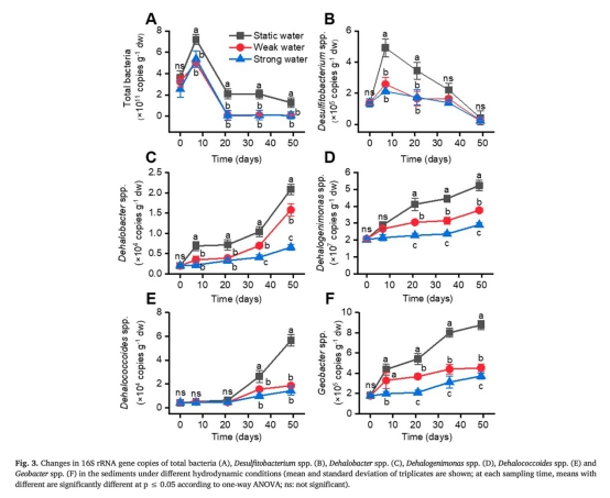 研究意義:水流擾動抑制OHRB生長(尤其Dehalogenimonas),直接關聯降解效率下降(r=0.88)。
