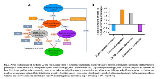 機制驗證:結合偏最小二乘路徑模型(PLS-PM)量化水動力→沉積物性質→微生物→HBCD降解的因果路徑(圖7)。