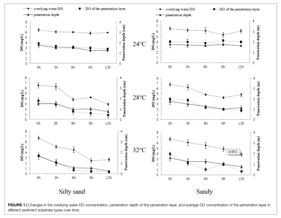 沉積物中的溶解氧和硫化氫數據(來自圖1和圖2)的研究意義在于揭示了溫度如何加速沉積物中的氧消耗和硫化氫釋放,幫助理解環境鏈式反應的機制,這對于預測和緩解夏季水產養殖區的缺氧風險至關重要。例如,數據顯示高溫下溶解氧滲透深度減少50-84%,硫化氫濃度最高達18.10μmol/L,這表明溫度是引發沉積物環境惡化的關鍵驅動因素。