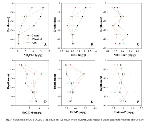 磷形態(圖3):分析不同結合態磷的轉化。意義:LMB將活性磷(NH?Cl-P、BD-P)轉化為穩定HCl-P(LaPO?),而PAC增加NaOH-rP(鋁結合磷)和HCl-P(鐵結合磷)。