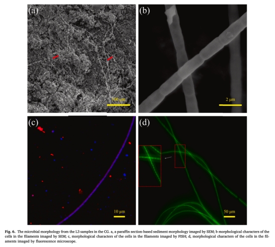 SEM顯示電纜細菌表面吸附大量顆粒(圖6a,b);FISH和熒光顯微驗證其活性及串珠結構(圖6c,d)。