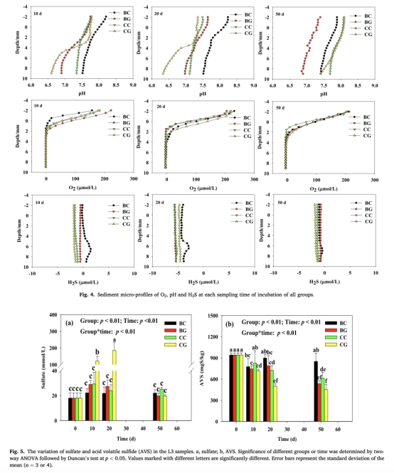 CG組亞氧區pH比對照組低0.3-0.5單位(圖4),酸化程度與硫酸鹽增幅(圖5a)正相關。