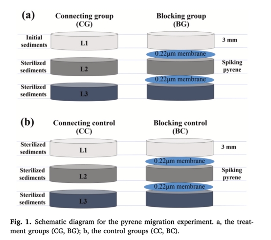 研究首次通過實驗證實微生物載體(特別是電纜細菌)能顯著促進沉積物中多環芳烴(PAHs)的遷移。以芘(pyrene)為模式污染物,設計"連接組"(CG,允許微生物遷移)和"阻斷組"(BG,限制微生物遷移)的沉積物微宇宙實驗。結果表明: