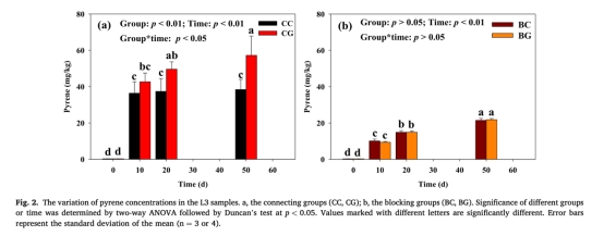 CG組L3層芘濃度(42.7-57.3 mg/kg)顯著高于CC組(36.4-38.4 mg/kg),證實微生物遷移主導芘的深層運輸。