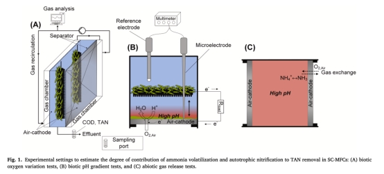 摘要指出:單室微生物燃料電池(SC-MFCs)中總氨氮(TAN)的去除機(jī)制尚不明確,硝化-反硝化和氨揮發(fā)是主要報(bào)道的途徑。本研究通過數(shù)學(xué)建模量化電化學(xué)氨氣提(EAS)對(duì)TAN去除的貢獻(xiàn),結(jié)合三類實(shí)驗(yàn)驗(yàn)證: