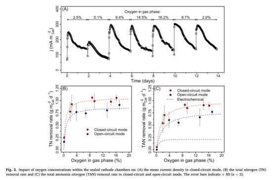 意義:氧濃度21%時(shí),閉路TAN去除率(730 mgN m?2 d?1)比開路高29%,量化電化學(xué)貢獻(xiàn)(ηEAS=22%)。