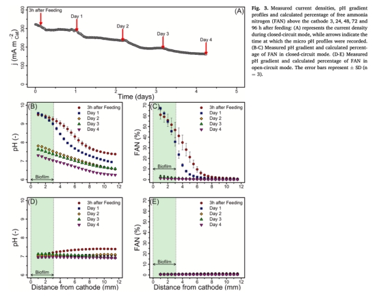 微電極(丹麥Unisense)測(cè)量陰極微區(qū)pH梯度(B-pH測(cè)試)顯示閉路時(shí)陰極表面pH峰值達(dá)9.6,游離氨(FAN)濃度39-40 mg L?1。