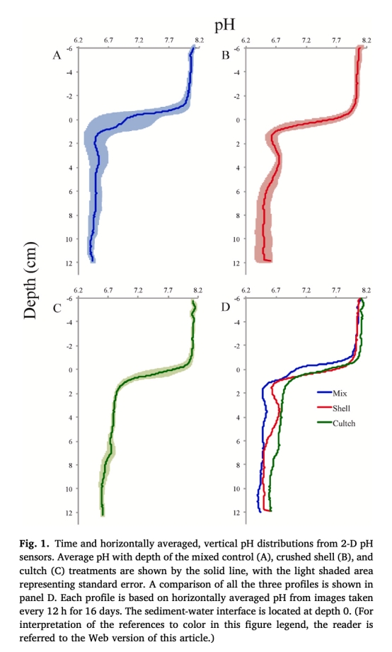 1. 孔隙水pH值:使用多種方法測量,包括Unisense微電極(2-D實驗末端、潛沙實驗)、Orion電極(多數實驗)、光學位移傳感器(2-D實驗時空動態)。意義:直接量化沉積物,尤其是表層1-2 cm(幼貝棲息區)的酸度狀況。貝殼添加顯著提高了pH(如:2-D實驗末,cultch處理pH=7.39 vs 對照6.89, Δ+0.5;潛沙實驗5mm蛤,cultch pH=7.61 vs 對照6.98, Δ+0.63;見Fig. 3B, Fig. 4A,D)。這表明貝殼有效中和了沉積物酸度。