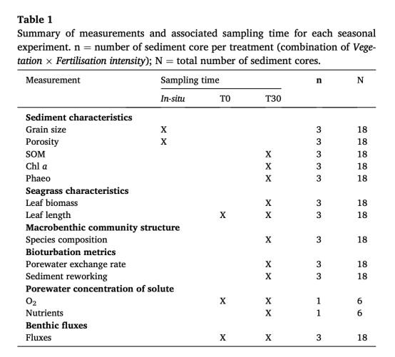 監測30天內沉積物特性、孔隙水化學、大型底棲動物活動及底棲通量變化(圖1)。
