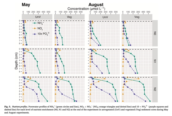 采集加拿大圣勞倫斯河口沉積物核心(含/不含海草),設置3個營養水平(N0: 背景值;N1: 2倍;N2: 4倍)和2個季節(5月/8月)。