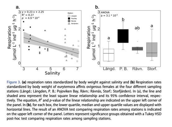 本研究通過沿芬蘭灣西部自然鹽度梯度(鹽度3-7)測量常見橈足類Eurytemora affinis的耗氧量,探究鹽度降低對橈足類代謝的影響。結果顯示,鹽度降低顯著增加橈足類的呼吸速率(耗氧量),表明低鹽環境對其造成生理脅迫。這一現象可能由氣候變化導致的淡水輸入增加引起,未來鹽度持續下降將提高橈足類能量需求,進而影響波羅的海等河口生態系統的食物網結構(如鯡魚和鯖魚的食物質量)。