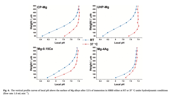 1. 采用Unisense pH微電極(尖端直徑10μm)原位監(jiān)測(cè)四種鎂合金在動(dòng)態(tài)HBSS中50μm高度界面的pH演變