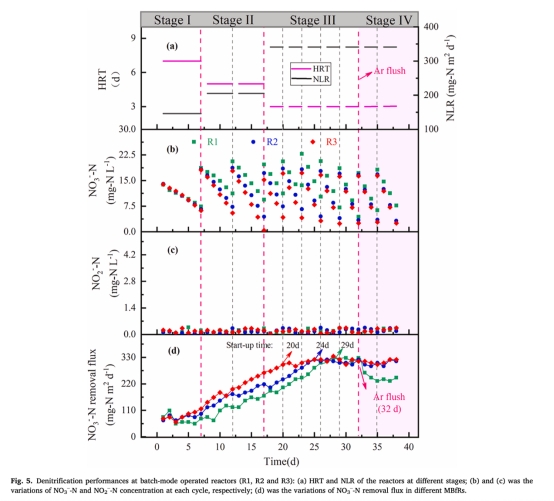 脫氮數據:高去除通量(圖5d)驗證改性膜縮短啟動時間(R3:20天 vs R1:29天)并提升效率。