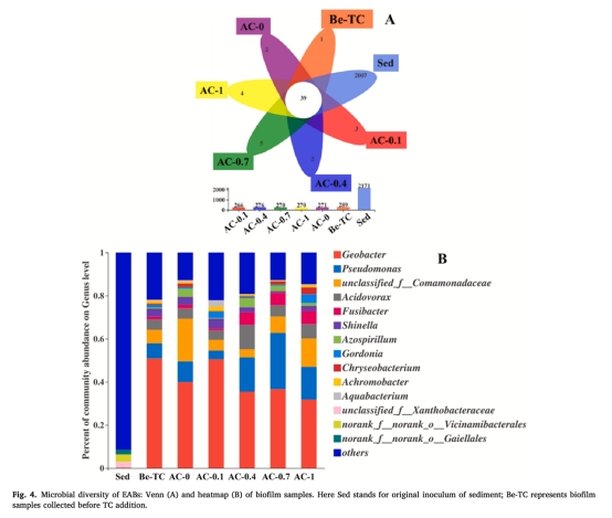 ? 數(shù)據(jù):AC-0.1維持Geobacter豐度(51%)和PTDB比例(71%),AC-1中Geobacter降至32%,假單胞菌(Pseudomonas)增至15%。