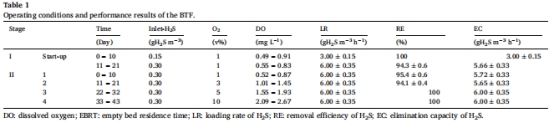 性能參數:H?S去除率(RE)、去除能力(EC)(表1);