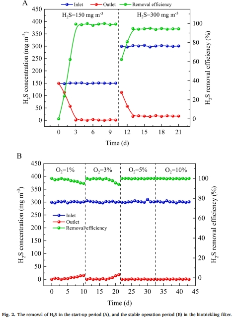 研究通過生物滴濾塔(BTF) 探究氧氣劑量(1%-10%)對H?S生物去除的影響機制。核心發現: