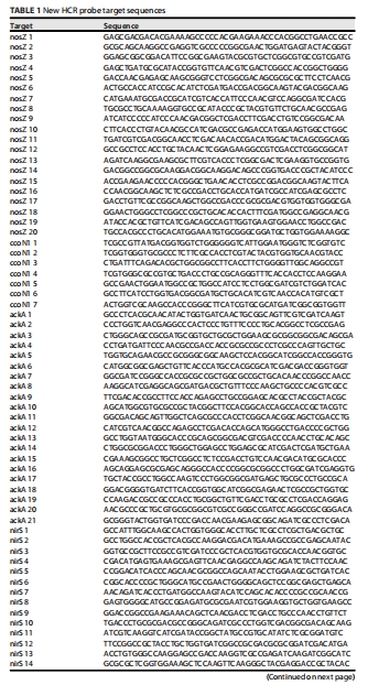 設(shè)計(jì)ccoN1(細(xì)胞色素c氧化酶)、narG(硝酸鹽還原酶)、nirS(亞硝酸鹽還原酶)、nosZ(氧化亞氮還原酶)、ackA(乙酸激酶)的HCR探針(表1);