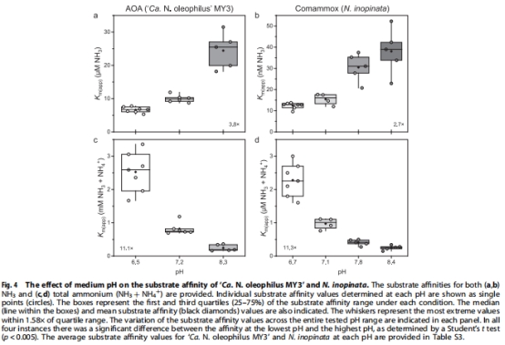 研究通過微呼吸測量法(microrespirometry) 揭示了氨氧化古菌(AOA)的氨親和力存在顯著差異: