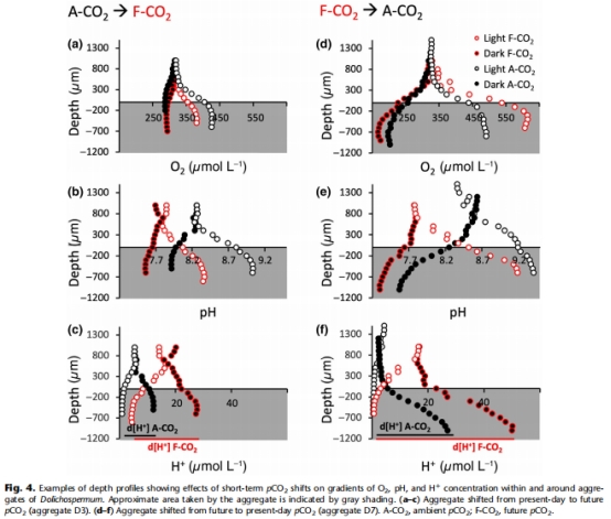 CO?極端消耗:光合作用使聚集體中心CO?降至0.5 μmol/L(現(xiàn)況pCO?)